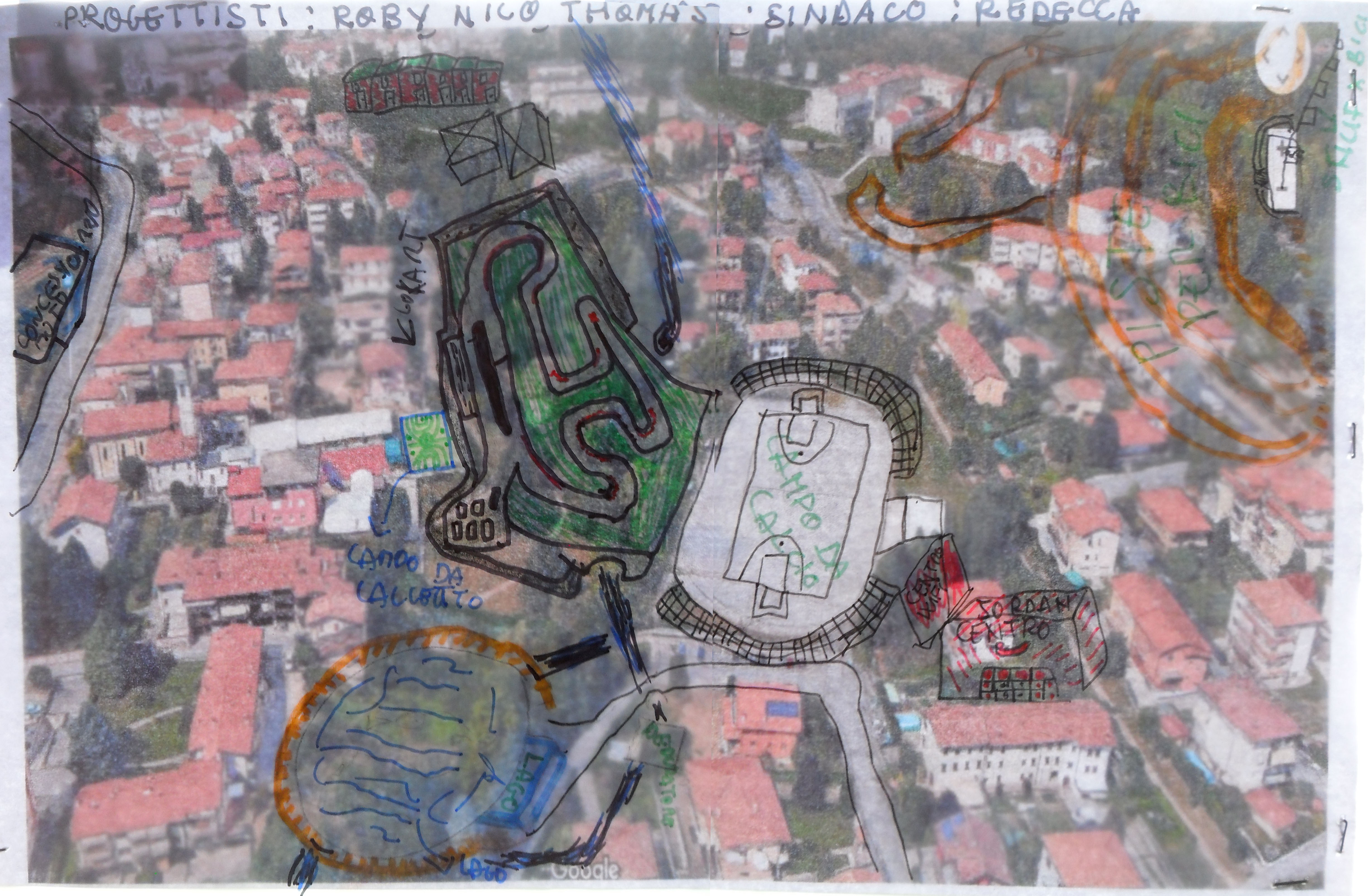 I ragazzi, giocando un po’ a fare gli architetti urbanisti e andando a valutare i lavori e le proposte altrui, hanno lavorato su vecchie fotografie e immagini più recenti del luogo. La carta da lucido come spazio di possibilità e immaginazione rispetto all’immagine reale sottostante, per far emergere i desideri e le visioni dei ragazzi rispetto agli spazi che abitano e di far calare nella dimensione pubblica della progettazione, che deve tenere in considerazione richieste, punti di vista, caratteristiche e vincoli territoriali complessi.